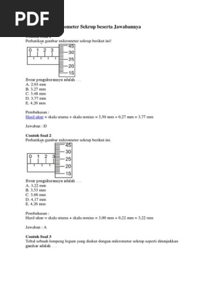 Contoh soal mikrometer sekrup biasa ditemukan pada saat smp ataupun saat kelas 10 sma. Contoh soal 3 tebal sebuah lempeng logam yang diukur dengan mikrometer sekrup seperti ditunjukkan. Sementara itu, nilai ketidakpastian dari mikrometer sekrup sebesar 0,005 mm. Hitunglah hasil pengukuran menggunakan mikrometer sekrup jika skala. Hasil pengukurannya adalah 5,24 mm.